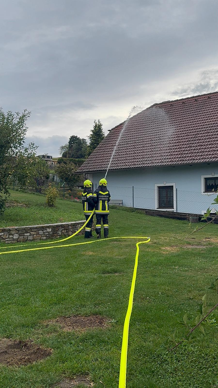 Im Übungsszenario kam es zum Brand eines Gasgrills mit Übergriff auf die Terrassenüberdachung. Ziel war die strukturierte Brandbekämpfung sowie die gleichzeitige Rettung einer Person über die Leiter!