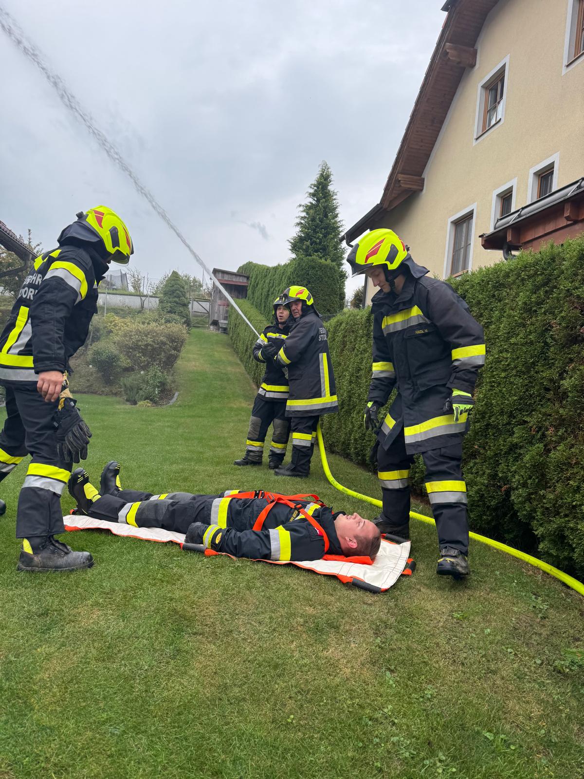 Im Übungsszenario kam es zum Brand eines Gasgrills mit Übergriff auf die Terrassenüberdachung. Ziel war die strukturierte Brandbekämpfung sowie die gleichzeitige Rettung einer Person über die Leiter!